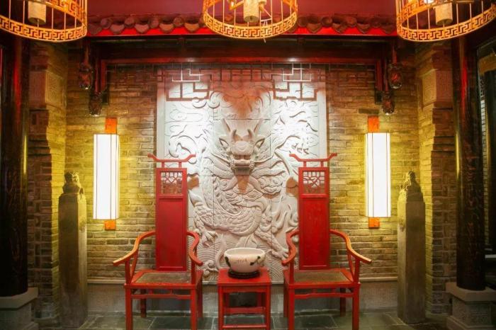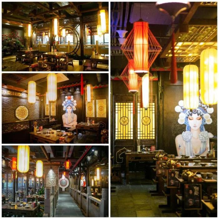 大红灯笼高高挂的装潢,古色古香的庭院风,墙上也是画着京剧中的角色。可以说是川味儿十足了。